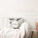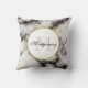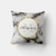 Een kussen met een stijlvol, modern gemarmerd patroon. Wit, zwart en rokerig grijs marmer met dunne linten van faux-gold wervelt door het patroon heen. Een witte cirkel met een faux-gold lijst gelaagd over de top met uw monogram initiaal en naam binnen.