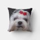 Modekussens met een foto van een Malteese hond, een kleine witte speelgoed. Ze heeft een rood lint in haar vacht.