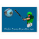 Een vrouwenbatter, die Moeder Natuur vertegenwoordigt, slaat een honkbalachtig wereldbol van de Aarde aan. Ook wordt tekst met de tekst "Moeder Natuur Altijd laatste vlekken" weergegeven. Het veroorzaken van veranderingen in het milieu kan onverwachte, en ongewenste, gevolgen hebben. Kies uw eigen achtergrondkleur.