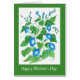 Een bloemig Moederdag met felblauwe oroe glory bloemen op een witte achtergrond met een overeenkomende groene rand en elegante witte letters. Het ontwerp is een handbeschilderde waterverf van Judy Adamson en je kunt de binnenste boodschap personaliseren.