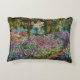 Een monetbloemkussen met prachtige roze en paarse irissen in een tuin die onder hoge bomen glijdt. Een geweldige cadeau van Monet voor fans van het indrukwekkende en Franse kunst. Vreedzame natuur, indrukwekkend met mooie bloemen en schilderachtig landschap.
