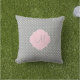 Monogrammed wit op grijs polka puntpatroon met pastelroze accent vierkantskussen. Het ontwerp is voorzien van een wit en grijs puntpatroon en een pastelroze quatrefolievorm met uw aangepast initiaal.