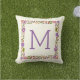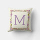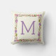 Uitstekende bloemige rand gooi of gooi kussen met mooie bloemetjes in paarse en oranje, groene bladeren en je monogram. Verander tekst met je eigen tekst.