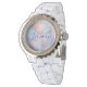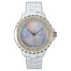 Een prachtig Rhinestone White Emaille horloge voor vrouwen met monogram naam in blauw op moeder-van-parel achtergrond.