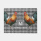 "Monogram naam Rooster Red Black and White Check Doormat." Uw persoonlijke monogram met handbeschilderd waterverf kunstwerk van een paar handgeschilderde rode, gouden, blauwe, groene, zwarte en witte roosters met een bijtende, noodlijdende, vormende gingham-controlepatroon dat in de problemen is gekomen. Kunst van internationaal erkende kunstenaar en ontwerper, Audrey Jeanne Roberts, copyright.