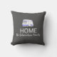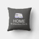 Moderne, donkergrijze reisvakantie-avontuurkussen. Illustratie van een monogram van de familie caravan HOME: pillow.