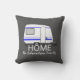 Moderne, donkergrijze reisvakantie-avontuurkussen. Illustratie van een monogram van de familie caravan HOME: pillow.