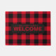 Deze mat is voorzien van zwarte en rode buffel check met een rode monogram familienaam en "Welkom" tekst op een zwarte faux burlap achtergrond Personaliseer met je eigen naam of om cadeau te geven.