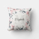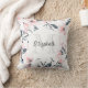 Een kussen met een elegant patroon gemaakt met een waterverf afbeelding van roze bloemen met blauw-grijze bladeren en stengels. Een witte cirkel die over bovenkant met jouw naam en monogram initiaal binnenin gelaagd wordt.