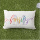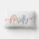 Witte buitenkant kussen met een gezin in een charmant script over je initiaal in de bleke lavendel. Het woord familie wordt geschreven in de kleuren van de regenboog: rood, oranje, geel, groen, blauw en paars.