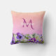 Een elegante grens van violet, lavender gekleurde, paarse en witte waterkleurige pansies op een roze en perzikkleurige achtergrond. Sjablonen voor een monogram en een naam, witte en paarse letters.