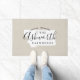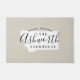Moderne boerenboerengepersonaliseerde doormat met je familienaam in je staatskaart. Faux burlap canvastextuurachtergrond. Klik op Aanpassen om uw eigen tekst en afbeeldingen toe te voegen en een uniek ontwerp te creëer!