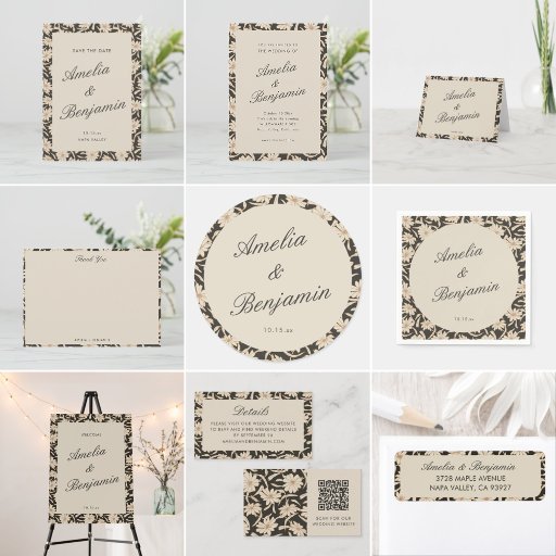 This save the date card features a vintage floral border in soft black and ivory for a refined, timeless look. The structured frame highlights elegant script names and wedding date details, creating a polished first impression for your celebration. Designed to coordinate with a neutral floral wedding suite, this save the date card sets the tone for a classic and thoughtfully styled event. A sophisticated choice for couples drawn to vintage-inspired wedding stationery.