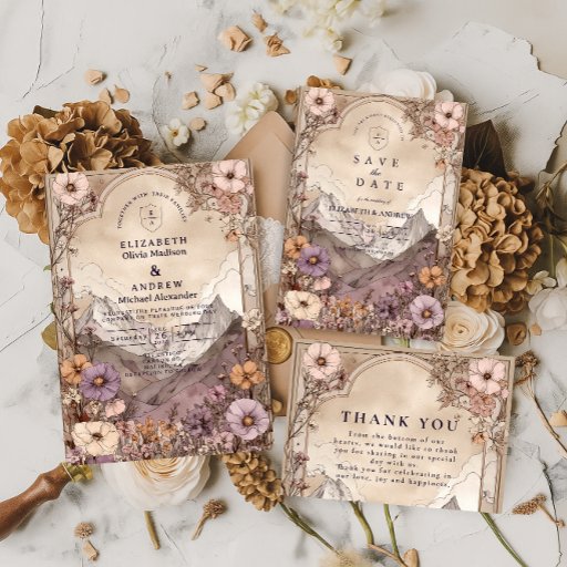 A romantic, moody wedding design inspired by layered mountain landscapes and vintage wildflowers in muted mauve, blush, and earthy neutrals. The hand-painted illustration style creates a timeless, old-world feel with soft depth and natural movement.