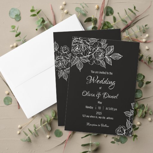 Deze zwart-witte huwelijksuitnodiging is perfect voor koppels die van gedurfde, donkere tinten houden en een elegante, humeurige sfeer willen voor hun grote dag. De pioenschets voegt een zachte bloementoets toe terwijl het ontwerp schoon en modern blijft. Een tijdloze keuze voor stijlvolle, onvergetelijke bruiloften.