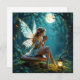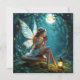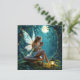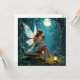 Een sprookjesachtige witte kaart met een fee die op een paddenstoel in een betoverd bos zit en wordt verlicht door lantaarns die een warme kop koffie drink. De boompjes zijn bedekt met sprankelende sprookjesachtige lichtjes en er schijnt een volle maan door de boomtakken.