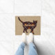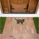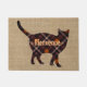 Een prachtig geruit kattensilhouet met Franse welkomsttypografie "Bienvenue". Warme kleuren tegen jute look textuur achtergrond. Rustiek deurmat ontwerp van Alma Wad voor kattenliefhebbers' huizen.