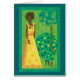 Mooi Afro-Amerikaans meisje in een gele formele jurk in een tuin van citrusbomen