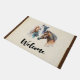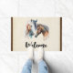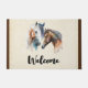 Een welkome deurmat met een prachtige waterverf tekening. Met een paar paarden, bruin en wit. Hoofd en hals zichtbaar met druipende verf langs de basis van hun hals. Zuidwestelijke sfeer.