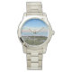 Dit pittoreske strandfotografie polshorloge met witte cijfers van Destin Florida heeft de prachtige roze en oranje zee zonsondergang die de oceaangolven boven het zand- en zandgras zachtjes raakt. Heerlijk kusthorloge vanaf uw favoriete vakantieoord of woonplaats.