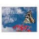 Een foto dicht bij elkaar van een kleurrijke vlinder die op een bloem tegen een blauwe achtergrond van de hemel voedt.