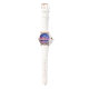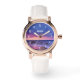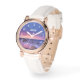 Een horloge met een mooie foto met opvallende kleuren van paarse, blauw en roze bij zonsondergang. Een kustlijn verspreid met rotsen.