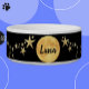 Black & Gold Moon Luna and Stars Personalized Pet Feeding and Water Bowl beschikt over een volle maan/luna met gouden sterren op een zwarte achtergrond die de nachtelijke hemel nabootst. Personaliseer het met de naam van uw huisdier - werkt voor een hond of kat of ander huisdier - en verander of voeg eenvoudig uw eigen afbeeldingen, tekst of achtergrond toe om een unieke creatie voor uw huisdier te maken of laat het zoals ontworpen voor een koele dierenkom. Zie andere gepersonaliseerde huisdier kommen evenals gepersonaliseerde inrichting voor thuis, kantoor of buiten op zazzle.com/DIYDecor.