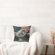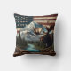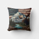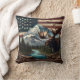 Een grote eland staat in de buurt van een rivier, omlijst door pijnbomen en bergen, met een achtergrond van de Amerikaanse vlag gemaakt van hout.