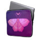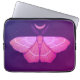 Witchy moth laptophoes in paarse en roze met magisch hekserig patroon van een gele mot in de nacht met halfmaan en sterretjes erboven op een donkere paarse achtergrond.