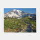 In het Paradise gebied is de Skyline trail een van de populairste trekpleisters - een 4 of 5 mijl loop door de topjes van de bergen met prachtige uitzichten. Hier is een scène met het beroemde pad dat kijkt naar de spectaculaire Mount Rainier op een zonnige dag met een blauwe lucht. Het is ook te zien als een breedbeeldbehang in de sectie National Parks op MLeWallpapers.com. Bekijk onze winkel voor meer landschapsfoto's van Mount Rainier National Park en andere beroemde Amerikaanse nationale parken.