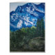 Het schilderen van de waterverf van het landschap van sneeuw bedekte bergen met groen bos en rotsen. Notitiekaartje