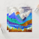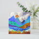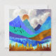 Dit prachtige ontwerp toont een kleurrijk berglandschap met opgeblazen bewolkte lucht en glooiende heuvels in gedurfde texturen en kleuren zoals blauw, blauwgroen, cyaan, goud en sinaasappel.