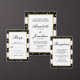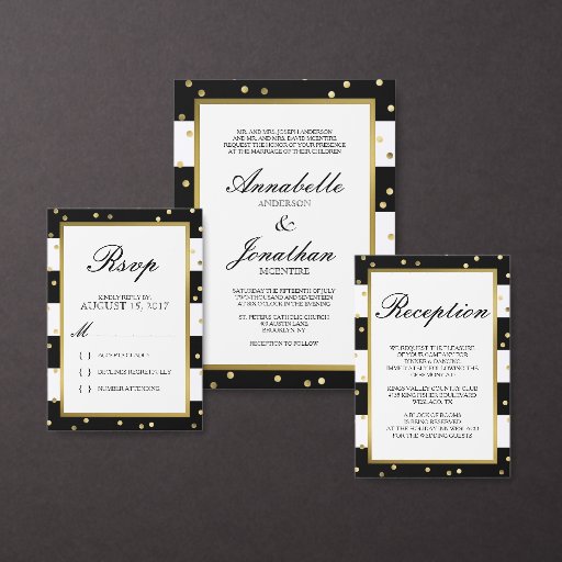 Dit elegante, moderne bruiloft collectie heeft een gewaagde zwart-wit gestreepte achtergrond met gouden stippen gestrooid langs de grens. Pas de achtergrondkleur aan om uw huwelijk of gebeurtenisthema aan te passen. Bezoek ons 'Sparkling Stripes' Wedding Collectie om alle overeenkomende producten te uitzichten. Pas elk nummer aan dat u nodig hebt voor uw evenement.