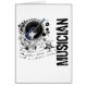 Een uniek digitaal hobbyontwerp van een elektrisch gitaar met een stadscyclus met "De alchemie van muziek" en het woord "muzikant" met opgeruimde kleding - alleen voor muzikanten.