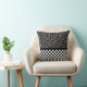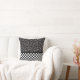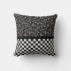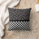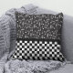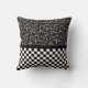 Het ontwerp van de vun-goot kussen heeft een diner uit de jaren '50 met het bovenste paneel van gekneusde witte muzieknoten op zwarte achtergrond en een zwart-wit dambordpatroon onderaan de helft.