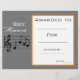 Een stijlvolle prijs voor een modern muziekcertificaat met een afbeelding van drie medewerkers, ideaal voor het aanmoedigen van een jonge muzikant. Je kunt in je eigen details schrijven. Een geweldige bron voor elk type muziekleraar.