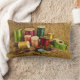 Deze kleurrijke lumbale kussen tonen de gereedschappen van de naadloze. Heldere schroefdraad in regenboogkleuren van groene, rode, roze, turquoise, geel, goud, blauw en oranje opzij naast een meetlint, duimel, knoppen en pennen. Al deze elementen zijn ingesteld op een afbeelding met een bruine achtergrond van het burlap-patroon.