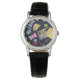 Rond gezichtshorloge met lederen band, zwarte achtergrond en kleurrijke naaibegrippen. Geweldig idee voor haar om een spoor van de tijd te houden tijdens het naaien in haar ambachtelijke kamer.