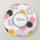 Abstract ontwerp met roze, donkergrijze, polka-stippen en gouden motieven. Dit is een trendy ronde sierkussen ideaal voor meditatie, yoga, bureaustoel, studentenhuis decoratie. Verander de elegante schriftnaam om het uw eigendom te maken met behulp van de meegeleverde sjabloon. De achterkant is een effen donkergrijs, afkomstig uit het ontwerp aan de voorkant. De afmetingen zijn 40 cm diameter wanneer plat en 35 cm wanneer opgevuld. 100% geborsteld polyester is kreukvrij. Wasbaar in de wasmachine, in staat om kleur te behouden en krimpen te weerstaan. Gemaakt in de VS. Zie "Over" voor informatie en verzorging.