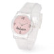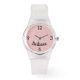 Een sportief horloge met een stevige doorzichtige siliconen gesp riem en een bleke roze faux glitter gezicht. Naam is een vet zwart scriptlettertype. Verander eenvoudig uw naam, vervang deze door monogram initialen of verwijder deze met behulp van de meegeleverde Sjabloon om deze van u te maken. Kies uit andere stijlen en kleuren.