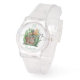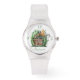 Dit is een 80s stijl helder siliconen riem rond horloge met een waterverf-afbeelding van een grillige houten grammofoon sprookjeshuis met gouden klankhoorn. Verfraaid met hoge groene planten, een reeks lichten, een paal met muzieknoot bovenaan en een ladder. De nummers zijn een modern lettertype met open gezicht in een donkergroen, net als de persoonlijke naam in plaats van het nummer 6. Wijzig de naam met behulp van de Sjabloon. Zie mijn notities in de Sjabloon voor uw gepersonaliseerde opties. Ook verkrijgbaar is een wit of zwart siliconen horloge. Het printen op deze horloges is uitstekend.