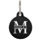 Houd uw huisdier veilig en verlies nooit meer met deze huisdierfunctie gepersonaliseerde witte monogram in klassieke serif doopvontstijl met doos van naam in het midden van monogram op zwarte achtergrond, met de code van de de contactinformatie QR van de eigenaar op de rug van het label. Ideaal voor honden, katten en geliefde huisdieren.