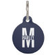 Houd uw huisdier veilig en verlies het nooit meer met deze huisdierachtige label eigenschap gepersonaliseerde witte monogram in vette moderne sans serif doopvontstijl met doos van naam in het midden van monogram op marine blauwe achtergrond, met de code van het contactQR van de eigenaar op de rug van het label. Ideaal voor honden, katten en geliefde huisdieren.