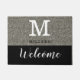 Een modern welkome vormgeving met zilveren glitter ziet er op een zwarte achtergrond uit en heet typografie welkom. Personaliseer met monogram initiaal letter en familienaam. Maakt een groot geschenk voor de nieuwe wieren en nieuwe huiseigenaars als een cadeau voor de opwarming van het huishouden. Je kunt ook je oude mat vervangen door de klastige zilverglittermat.