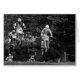 Motorfietsen die over een sprong in een Motocross vergadering gaan.