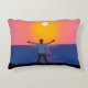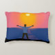Een man staat op een strand dat naar het open zee kijkt en de gele zon groet met verhoogde armen.