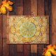 De herfstbladerbladeren van A. Mucha van de L31 Documents Décoratifs, 1902. Zij zijn voorzien van mapparaat- en kastanjebladeren in warme valkleuren met een cirkel in het midden. Het ontwerp werd bewerkt en toegepast op verschillende artikelen door Alma Wad.