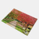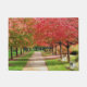 Een kleurrijke foto van bomen langs een vreedzame weg met banken.