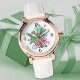 Beautiful ladies rose gold round watch featuring a charming watercolor Christmas bouquet, with evergreen fir branches, red holly berries and red-white buffalo plaid bow. Black decorative primary numbers, black script name and vintage white leather strap. Easily change or remove name to make it yours using the Template provided. This rose gold style is available with a black or brown leather strap. See "About this Product" for more information and specs on sizes, movement type and warranty.