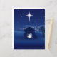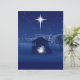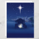 The design features a classic Nativity scene silhouette set against a deep indigo and midnight blue sky. The focal point is the bright Star of Bethlehem shining down over a humble stable where Mary, Joseph, and the baby Jesus are gathered, surrounded by a soft, ethereal glow. In the background, the simple lights of the town of Bethlehem glow softly.